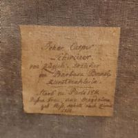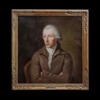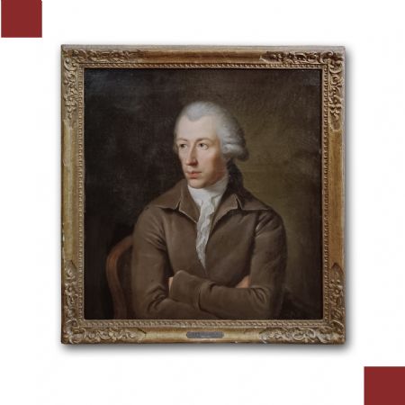 Bellissimo ritratto ad olio su tela, corredato da una cornice coeva in legno intagliato e dorato a foglia d’oro. Sul retro del dipinto si legge, tramite il biglietto presente, che l’opera raffigura il filantropo Johann Caspar Schweirer, nato a Zurigo e morto a Parigi nel 1811, il quale fu padre adottivo della pittrice svizzero-francese Anna Barbara Bansi (1777-1863). Nel ritratto, Schweirer è rappresentato con abiti e acconciatura tipici della metà del XVIII secolo: parrucca bianca, cappotto chiuso e giacca bianca con tessuto sul davanti. Le mani incrociate e lo sguardo sfuggente, quasi pensieroso, contribuiscono a rendere il dipinto realistico, evidenziando un sapiente uso del chiaroscuro e una grande perizia pittorica. Come indica la targa sulla parte frontale del dipinto, l’opera è attribuita all’artista J.H.W. Tischbein (1751-1829), noto pittore e incisore tedesco, celebre per i suoi dipinti storici, soggetti mitologici e ritratti, tra cui quelli dell’amico Goethe. Per questa ragione, si tratta di un quadro di grande unicità storica, da ascrivere intorno alla seconda metà del XVIII secolo.
