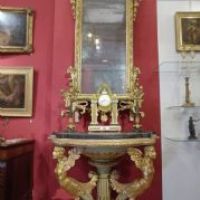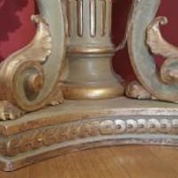 Elegante consolle a mezzaluna leggermente centinata, realizzata in legno intagliato a mano, dorato a foglia d’oro e dipinto. La consolle presenta una base geometrica e un fusto a colonnina, dipinti di colore salvia e impreziositi da dettagli dorati. A decorare ulteriormente la parte inferiore, vi sono due protomi femminili alate e dorate, nude, che emergono da riccioli vegetali alla base, conferendo eleganza, raffinatezza e un tocco di gusto antico. Il piano, anch’esso in legno, è decorato con finti intarsi di marmo a motivi floreali, che arricchiscono ulteriormente il mobile. Si tratta di una consolle elegante da palazzo, in grado di arredare con gusto e raffinatezza qualsiasi ambiente. Manifattura genovese (Genova, Italia) del periodo impero, intorno ai primi del XIX secolo.
