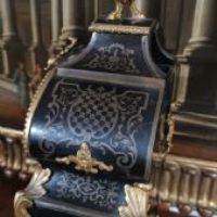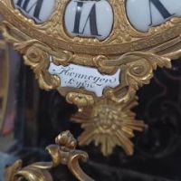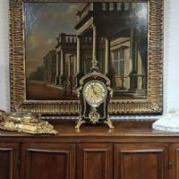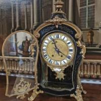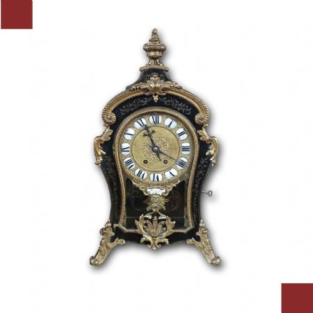 Elegante orologio da tavolo con cassa centinata, realizzata in legno intagliato a mano ed ebanizzato, decorata con dettagli in bronzo fuso a cera persa e dorato. A conferire ulteriore raffinatezza contribuiscono gli intarsi in ottone sul legno, caratterizzati da motivi vegetali e geometrici che richiamano i motivi e le tecniche di costruzione del celebre ebanista francese Boulle del XVIII secolo. Il meccanismo dell’orologio si presenta in perfette condizioni ed è dotato di una suoneria che emette le ore e le mezzore, con carica settimanale. Il quadrante è caratterizzato da numeri romani, mentre la cassa è apribile anche sul fronte, dotata di vetro, e presenta vetri anche sui lati. Il pendolo, in bronzo dorato, raffigura il tipico sole settecentesco. Sul fronte, sotto il quadrante, è visibile la scritta “Henneger Lyon”, riferibile all’ebanista francese di Lione, mentre nel meccanismo sono timbrati i numeri “239” e la dicitura “Bailly Weibel - Lyon”, ascrivibile all’orologiaio francese anch’egli di Lione. Questo orologio è unico, e rappresenta un raffinato elemento di arredamento, capace di impreziosire con gusto qualsiasi ambiente. Manifattura francese della metà del XIX secolo, in stile Luigi XV.