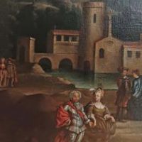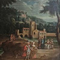 Raffinato dipinto a olio su tela, incorniciato da una cornice di legno intagliato dorato ed ebanizzato. Il dipinto raffigura un paesaggio collinare con un bosco, al cui interno si intravedono architetture e figure. Al centro si trova un mulino, circondato dall’acqua, con alberi e altre figure disposte attorno. In primo piano appaiono due personaggi, uomo e donna, intenti in una passeggiata, vestiti con abiti d’epoca di raffinata fattura, e accanto a loro due cani. Dietro di loro, sulla destra, un gruppo di giovani impegnati in una chiacchierata; sulla sinistra, più in lontananza, si scorgono altre due figure, uomo e donna, anch’essi vestiti con austerità elegante. Nell’opera l’artista padroneggia la tecnica del chiaroscuro e una pittura di stile realistico. Si tratta di un dipinto pregevole, in grado di arredare con gusto e raffinatezza qualsiasi ambiente. Manifattura francese della fine del XVIII secolo.