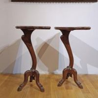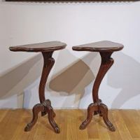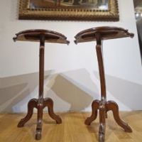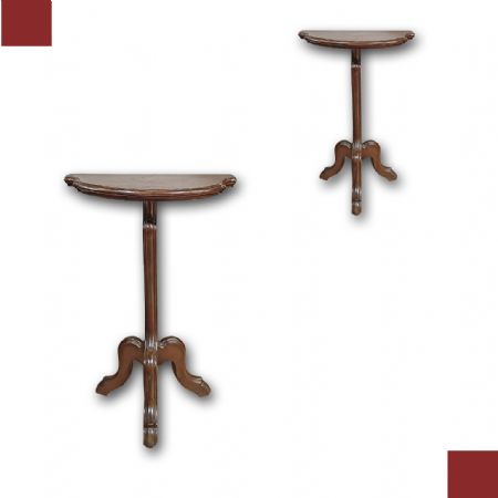 Elegante coppia di piccole consolle guéridon in massello di noce, finemente intagliate a mano. Ciascuna presenta un fusto ricurvo che si apre in tre piedi a ricciolo, che ne accentuano la grazia, e un piano sagomato che dona eleganza. Una coppia unica, di buona fattura, capace di impreziosire con gusto e raffinatezza qualsiasi ambiente. Manifattura veneta (Nord-Italia) in stile Luigi XV, da ascrivere al XIX secolo.