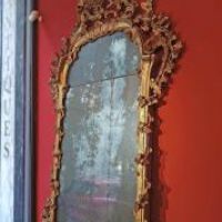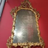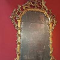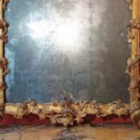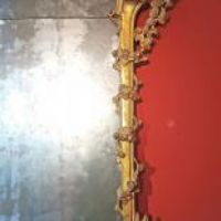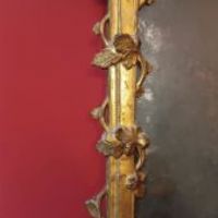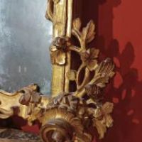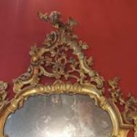 Raffinata specchiera in legno di cirmolo intagliato e dorato a foglia d’oro zecchino. Si distingue per sontuose volute a girali e trecce vegetali, in perfetto stile Luigi XV, che conducono ad una grande cimasa ancora più ricca di foglie, rami e intrecci. La specchiera conserva inoltre gli specchi e la doratura originali. Si tratta di un mobile di grande classe capace di arredare con un tocco di antichità e raffinatezza qualsiasi ambiente. Manifattura Lucchese (Toscana, Italia) del periodo Luigi XV, intorno alla metà del XVIII secolo.