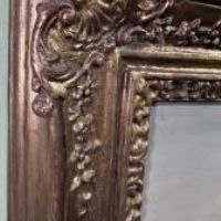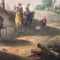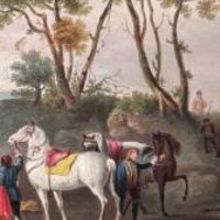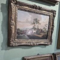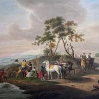 Grazioso dipinto ad olio su tavoletta di rovere, corredato da una cornice coeva in legno intagliato e dorato a pastiglia con foglia d’oro. L'opera raffigura una scena campestre animata, dove si intravedono figure a riposo lungo un fiume. Tra i personaggi si notano cavalieri e cani da caccia, mentre una donna è seduta accanto a un uomo in piedi che si sta togliendo il cappello. Il paesaggio, di gusto romantico, si distingue per la buona resa pittorica e stilistica. Il dipinto si presenta in buone condizioni conservative, con minimi interventi di restauro. Si tratta di un’opera di pregevole fattura, capace di arricchire con gusto e raffinatezza qualsiasi ambiente. Manifattura attribuibile alla scuola inglese dei primi del XIX secolo (1820 ca.).
