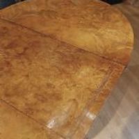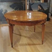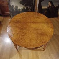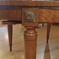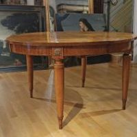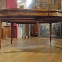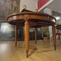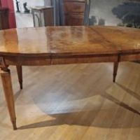 Raffinato tavolo da pranzo ovale in radica di tuja, intagliato a mano. Il tavolo è caratterizzato da quattro gambe dritte con piedi terminanti a puntale, e una fascia del sottopiano decorata con dettagli floreali in bronzo fuso a cera persa. Il piano è intarsiato, con filetti geometrici in legno di rosa che ne esaltano l’eleganza complessiva. Inoltre, il tavolo è allungabile e dotato di una prolunga anch’essa in radica di tuja. Si tratta di un mobile di grande gusto ed eleganza, in grado di arredare con raffinatezza qualsiasi ambiente. Manifattura francese della metà del XIX secolo.