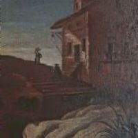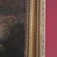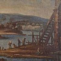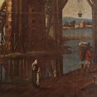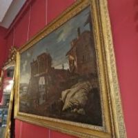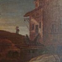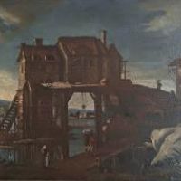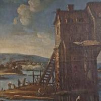 Grande dipinto ad olio su tela, corredato da una cornice coeva in legno intagliato e dorato a foglia d’oro zecchino. Sul dipinto è raffigurata una città lungo il fiume, con al centro un mulino, e vari personaggi intenti a trasportare oggetti, a lavare i panni e a prendere l’acqua. L’opera si presenta con una notevole qualità pittorica e realistica, caratterizzata da un ricco uso di colori e di tecniche pittoriche. Si tratta di un dipinto di grande bellezza e antichità, in grado di arredare con eleganza e raffinatezza qualsiasi ambiente. Manifattura attribuibile alla Scuola Veneta, intorno alla fine del XVII secolo.