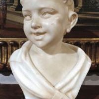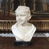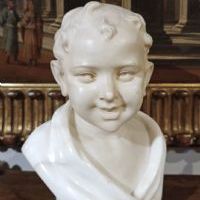 Bellissima scultura in marmo bianco, caratterizzata da poche venature grigie, montata su una base in marmo nero con piccole venature bianche. La scultura raffigura un bambino sorridente, con il volto leggermente girato e a mezzo busto, vestito con dei panni a fascia sul corpo. La particolarità risiede nella rappresentazione del volto, in cui si evidenzia la grande maestria nella resa scultorea dei dettagli, tra cui i riccioli dei capelli, gli occhi e la bocca che si apre in un sorriso. Si tratta di un'opera di grande bellezza e raffinatezza scultorea, capace di donare un tocco di eleganza e di aria antica a qualsiasi ambiente. Manifattura italiana della fine del XIX secolo, in stile neo-rinascimentale.