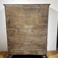 Elegante stipo in legno di abete, finemente intagliato e decorato a tempera magra nei toni del bianco, giallo, marrone, nero e verde. La struttura presenta angoli scantonati, con piedi a mensola che ne esaltano la linea sobria e raffinata. Dotato di due sportelli che si aprono grazie a una chiave in bronzo, al loro interno si dispongono tre ripiani ergonomici ideali per riporre oggetti di vario genere. La decorazione pittorica, accuratamente realizzata sia sul fronte che sui lati, conferisce un tocco di eleganza ulteriore al mobile, richiamando motivi di tarsie geometriche con losanghe centrali. Si tratta di un mobile di grande gusto e raffinatezza, capace di impreziosire con eleganza qualsiasi ambiente. Manifattura marchigiana (centro Italia), del periodo Luigi XIV, intorno alla prima metà del XVIII secolo.