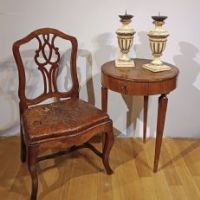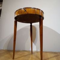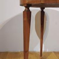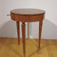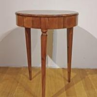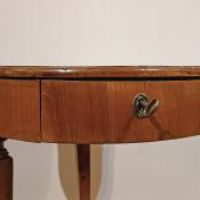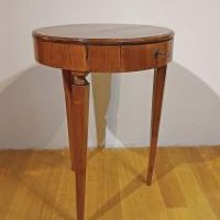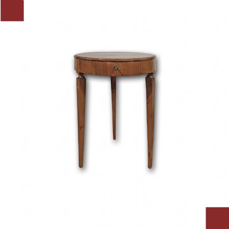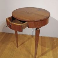 Raffinato tavolino lastronato in noce, finemente intagliato. Il mobile è composto da tre gambe troncopiramidali, tipiche del periodo, e da un piano con una fascia circolare. Il tavolino è dotato di un piccolo cassetto, pratico per riporre oggetti di piccole dimensioni. Si tratta di un mobile di grande gusto ed eleganza, capace di arredare con classe qualsiasi ambiente, ideale da posizionare accanto a un divano. Manifattura toscana del periodo Luigi XVI, intorno alla seconda metà del XVIII secolo.