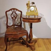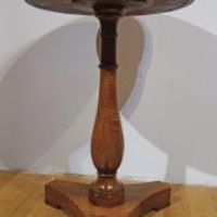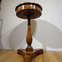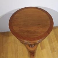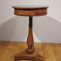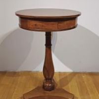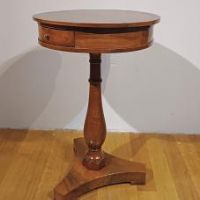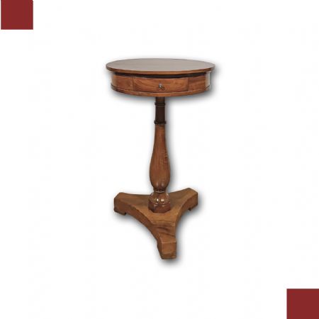Raffinato tavolino lastronato in legno di ciliegio e noce. La sua gamba centrale, tornita in massello di noce, si distingue per eleganza, con un piede triangolare che ne completa la linea. Il piano rotondo è impreziosito da una fascia esterna in ciliegio, conferendo un tocco di raffinatezza in più. Completato da un piccolo cassetto, ideale per riporre oggetti di uso quotidiano, questo tavolino unisce funzionalità e stile in un design sofisticato. Manifattura toscana del periodo Carlo X, intorno alla metà del XIX secolo.