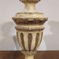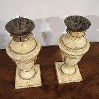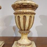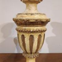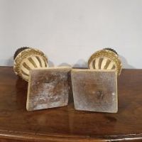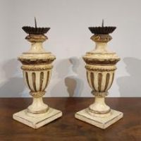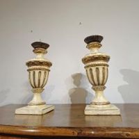 Elegante coppia di candelabri in legno di cirmolo intagliato e laccato color avorio, impreziositi da rifiniture dorate in oro zecchino. I candelabri presentano una pianta quadrata e una forma ad anfora liscia, esaltata da dettagli raffinati. Le decorazioni dorate conferiscono un tocco di classe e di eleganza superiore. Questa coppia di portacandele è versatile, adatta sia per l'uso come candelabri che come porta lampade; è possibile elettrificarli e impiegarli come abat-jour, rendendoli complementi decorativi di grande pregio e funzionalità. Manifattura toscana (centro-Italia) del periodo neoclassico, intorno alla seconda metà del XVIII secolo.