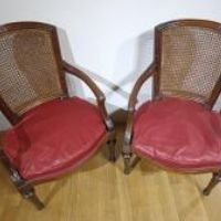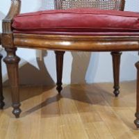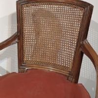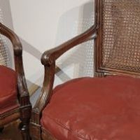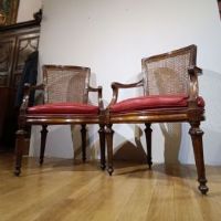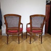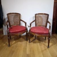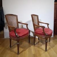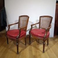 Elegante coppia di poltrone realizzate in legno massello di noce, finemente intagliate con dettagli raffinati. Le poltrone si distinguono per le gambe troncopiramidali, sapientemente tornite, i braccioli ricurvi e lo schienale impreziosito da un intreccio geometrico in canna, che conferisce un tocco di originalità. La seduta, estremamente confortevole, è completata da un cuscino in piume rivestito in pelle rosso bordeaux, esaltando ulteriormente l’eleganza complessiva. Questa coppia di poltrone rappresenta un esempio di stile e raffinatezza, capace di arredare con classe e carattere qualsiasi ambiente. Manifattura toscana del periodo neoclassico, intorno alla fine del XVIII secolo.