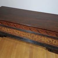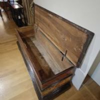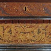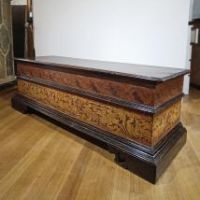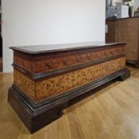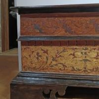 Elegante cassapanca in legno di noce massello, intagliata e dipinta. La cassapanca presenta una forma rettangolare, con piedi a mensola, un piano aggettante e una fascia modanata. Il piano è apribile, rivelando al suo interno un ampio spazio per riporre oggetti. La sua particolarità risiede nei decori pittorici, che ne esaltano l’eleganza, con motivi di intrecci vegetali su sfondo rosso e giallo, dal gusto e richiamo ancora rinascimentale. Si tratta di un mobile, probabilmente utilizzato come guardaroba o cassa nuziale, capace di arredare con raffinatezza e un tocco di antichità qualsiasi ambiente. Manifattura emiliana (Emilia-Romagna, Italia), del periodo Luigi XIV, intorno ai primi del XVII secolo.
