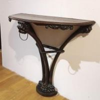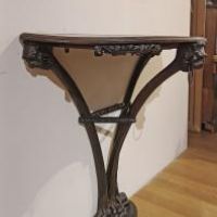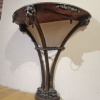 Elegante consolle in noce massello finemente intagliata. La consolle presenta un piano a mezzaluna e tre gambe ferine. È decorata con intagli geometrici, fitomorfi e protomi di leoni agli angoli e al centro, che ne esaltano la raffinatezza. Si tratta di una consolle da muro, dotata di supporti per l'affissione, capace di impreziosire qualsiasi ambiente con un tocco di classe e di antichità. Manifattura toscana del periodo neoclassico, intorno alla seconda metà del XVIII secolo.