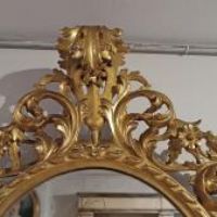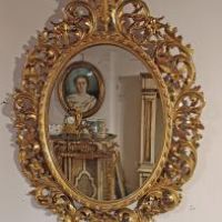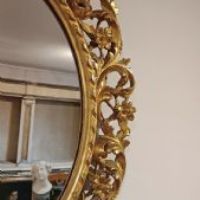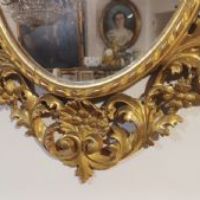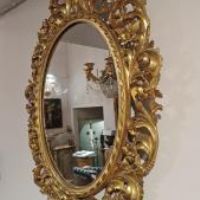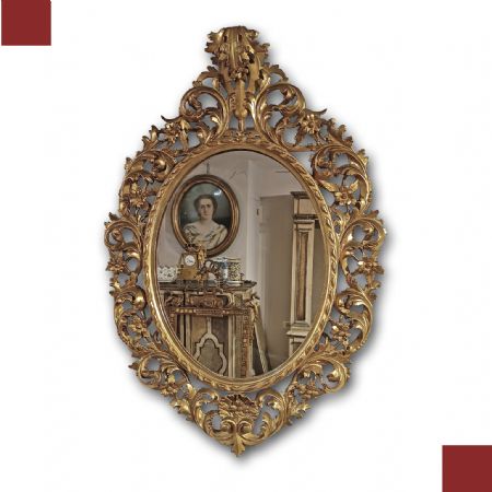 Raffinata specchiera di medie dimensioni e dalla forma ovale, realizzata in legno finemente intagliato e dorato a foglia d’oro zecchino. La cornice d’epoca si distingue per le eleganti volute vegetali che ne impreziosiscono l’aspetto, conferendo grande raffinatezza. Lo specchio, in ottime condizioni, completa questa raffinata opera d’arredo. Si tratta di una specchiera capace di arredare con gusto e raffinatezza qualsiasi ambiente. Manifattura fiorentina ascrivibile al periodo in cui Firenze fu capitale d’Italia, intorno alla seconda metà del XIX secolo (1875 ca.).
