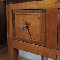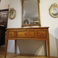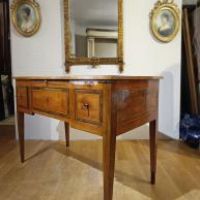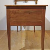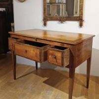 Elegante piccolo scrittoio da centro lastronato in legno di noce, con intarsi in legni di vari frutti. Lo scrittoio si distingue per le gambe troncopiramidali, tipiche del periodo, e presenta intarsi a filetti geometrici sul fronte, sul piano sui lati e sul retro. Il mobile dispone di tre cassetti sul fronte, ideali ed ergonomici per riporre oggetti e apribili con chiavi, mentre sul retro sono riproposti i tre cassetti però finti, consentendo di posizionare lo scrittoio anche al centro della stanza. È inoltre dotato di un piccolo piano estraibile, rivestito in tessuto verde. Si tratta di uno scrittoio di grande gusto ed eleganza, in grado di arredare con classe qualsiasi ambiente. Manifattura toscana del periodo neoclassico, intorno alla seconda metà del XVIII secolo.