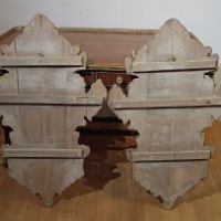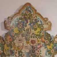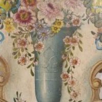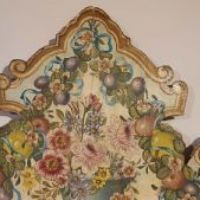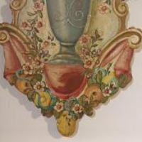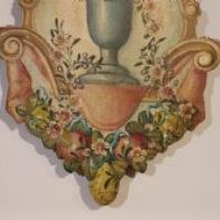 Elegante coppia di pannelli in legno di abete intagliato e centinato, finemente dipinti a tempera magra. Nei due pannelli sono raffigurati al centro due vasi, ornati da fiori e frutti, circondati da una cornice a volute geometriche. I pannelli si trovano in buono stato di conservazione, e le loro pitture sono apprezzabili per la resa stilistica e l’uso dei colori. Questa coppia di pannelli, grazie alla loro eleganza e raffinatezza, è in grado di conferire un tocco di classe e di antichità a qualsiasi ambiente. Manifattura tipica marchigiana (centro-Italia), della metà del XIX secolo.