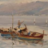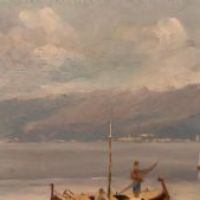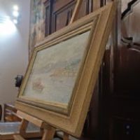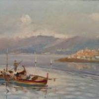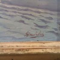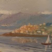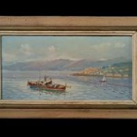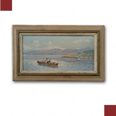Grazioso dipinto ad olio su tavoletta lignea, inserito in una cornice di legno intagliato e dipinto. Nel dipinto è raffigurata una veduta paesaggistica con mare e montagne, dalla quale si intravede una marina con una città nelle vicinanze, probabilmente la marina di Pizzo Calabro, che richiama le origini calabresi del pittore. In mare si distinguono diverse barche a vela, tra cui due in primo piano con personaggi intenti a pescare. Si tratta di un quadro di grande gusto, apprezzabile per la sua resa stilistica e la scelta dei colori, in grado di donare un tocco di eleganza e classe a qualsiasi ambiente. In basso a destra è presente la firma del pittore italiano, Saverio Scutellà (1910-1993), con la data apposta sul retro da inquadrare intorno alla prima metà del XX secolo (1947 ca.).