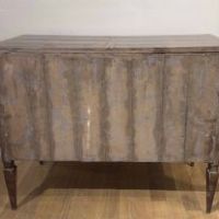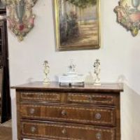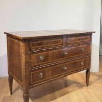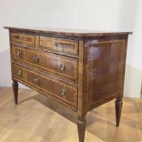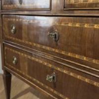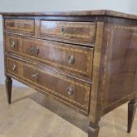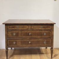 Raffinato cassettone finemente lastronato in piuma di noce, impreziosito da intarsi a filetti geometrici realizzati in piuma di noce e legni di frutto. Il mobile si distingue per le gambe troncopiramidali, tipiche del periodo, e presenta quattro cassetti: due di dimensioni ridotte e due più grandi, ergonomici, ideali per riporre vari oggetti. I cassetti sono decorati con eleganti geometrie di intarsi, che si ripetono anche sui lati del cassettone, e sono dotati di maniglie e serrature in bronzo fuso a cera persa. Si tratta di un cassettone di grande gusto e raffinatezza, capace di arredare con classe ed eleganza qualsiasi ambiente. Manifattura emiliana (Emilia-Romagna, Italia) del periodo neoclassico, intorno alla seconda metà del XVIII secolo.
