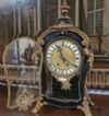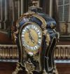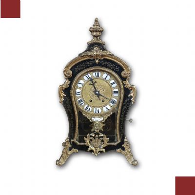 Elegante orologio da tavolo con cassa centinata, realizzata in legno intagliato a mano ed ebanizzato, decorata con dettagli in bronzo fuso a cera persa e dorato. A conferire ulteriore raffinatezza contribuiscono gli intarsi in ottone sul legno, caratterizzati da motivi vegetali e geometrici che richiamano i motivi e le tecniche di costruzione del celebre ebanista francese Boulle del XVIII secolo. Il meccanismo dell’orologio si presenta in perfette condizioni ed è dotato di una suoneria che emette le ore e le mezzore, con carica settimanale. Il quadrante è caratterizzato da numeri romani, mentre la cassa è apribile anche sul fronte, dotata di vetro, e presenta vetri anche sui lati. Il pendolo, in bronzo dorato, raffigura il tipico sole settecentesco. Sul fronte, sotto il quadrante, è visibile la scritta “Henneger Lyon”, riferibile all’ebanista francese di Lione, mentre nel meccanismo sono timbrati i numeri “239” e la dicitura “Bailly Weibel - Lyon”, ascrivibile all’orologiaio francese anch’egli di Lione. Questo orologio è unico, e rappresenta un raffinato elemento di arredamento, capace di impreziosire con gusto qualsiasi ambiente. Manifattura francese della metà del XIX secolo, in stile Luigi XV.