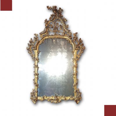 Raffinata specchiera in legno di cirmolo intagliato e dorato a foglia d’oro zecchino. Si distingue per sontuose volute a girali e trecce vegetali, in perfetto stile Luigi XV, che conducono ad una grande cimasa ancora più ricca di foglie, rami e intrecci. La specchiera conserva inoltre gli specchi e la doratura originali. Si tratta di un mobile di grande classe capace di arredare con un tocco di antichità e raffinatezza qualsiasi ambiente. Manifattura Lucchese (Toscana, Italia) del periodo Luigi XV, intorno alla metà del XVIII secolo.
