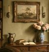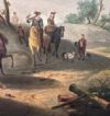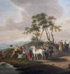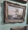 Grazioso dipinto ad olio su tavoletta di rovere, corredato da una cornice coeva in legno intagliato e dorato a pastiglia con foglia d’oro. L'opera raffigura una scena campestre animata, dove si intravedono figure a riposo lungo un fiume. Tra i personaggi si notano cavalieri e cani da caccia, mentre una donna è seduta accanto a un uomo in piedi che si sta togliendo il cappello. Il paesaggio, di gusto romantico, si distingue per la buona resa pittorica e stilistica. Il dipinto si presenta in buone condizioni conservative, con minimi interventi di restauro. Si tratta di un’opera di pregevole fattura, capace di arricchire con gusto e raffinatezza qualsiasi ambiente. Manifattura attribuibile alla scuola inglese dei primi del XIX secolo (1820 ca.).