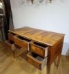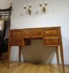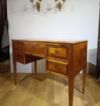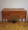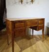Elegante piccolo scrittoio lastronato in legno di noce e ulivo, finemente intagliato. Lo scrittoio si distingue per le gambe troncopiramidali, tipiche del periodo, e presenta raffinati intarsi sia sul fronte che sul piano, al centro dei quali si trova una stella, con parti in radica che creano eleganti disegni geometrici. Il mobile dispone di cinque cassetti sul fronte, ideali ed ergonomici per riporre oggetti, e si presenta a giorno, poiché è lastronato anche sul retro, consentendo di posizionarlo anche al centro della stanza. Si tratta di uno scrittoio di grande gusto ed eleganza, in grado di arredare con classe qualsiasi ambiente. Manifattura toscana del periodo neoclassico, intorno alla seconda metà del XVIII secolo.