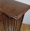 Elegante piccola credenza in massello di noce, finemente intagliato a mano. La credenza presenta dei piedi a mensola, un piano in massello ed è inoltre decorata da intagli a losanghe geometriche sul fronte e sui lati, che donano ulteriore raffinatezza. La credenza è apribile mediante uno sportello, dotato di un pomolo in bronzo tornito e fuso a cera persa, particolare inoltre che anche i pilastri sono apribili. Si tratta di un mobile di grande gusto ed eleganza, in grado di arredare con classe qualsiasi ambiente. Manifattura toscana, del periodo Luigi XIV, intorno agli inizi del XVIII secolo.