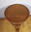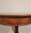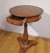 Raffinato tavolino lastronato in legno di ciliegio e noce. La sua gamba centrale, tornita in massello di noce, si distingue per eleganza, con un piede triangolare che ne completa la linea. Il piano rotondo è impreziosito da una fascia esterna in ciliegio, conferendo un tocco di raffinatezza in più. Completato da un piccolo cassetto, ideale per riporre oggetti di uso quotidiano, questo tavolino unisce funzionalità e stile in un design sofisticato. Manifattura toscana del periodo Carlo X, intorno alla metà del XIX secolo.