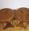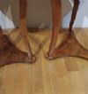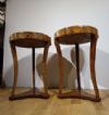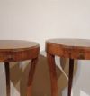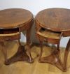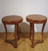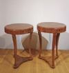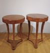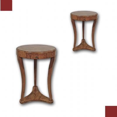Elegante coppia di tavolini lastronati in legno di noce, impreziositi da raffinati intarsi in legno di frutto. I tavolini si distinguono per le gambe a sciabola, unite da un basamento triangolare, e per il piano privo di sporgenze con un elegante bordo a becco di civetta. Ogni tavolino è dotato di un piccolo cassetto, ideale per riporre oggetti di piccole dimensioni. La loro raffinatezza è accentuata dagli intarsi floreali presenti sul piano, sulla fascia sottostante e sul piede, conferendo un tocco di grande eleganza e lusso. Questa coppia di tavolini rappresenta un esempio di gusto e raffinatezza, capace di arredare con classe e stile qualsiasi ambiente. Manifattura toscana del periodo Direttorio, intorno alla fine del XVIII secolo.