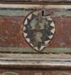 Elegante e unica cassapanca in legno massello di castagno, dipinta a tempera magra nei toni del rosso, verde, giallo e nero. La cassapanca ha forma rettangolare, con piedi a mensola e un piano sporgente. Al suo interno, molto spazioso, è presente anche un piccolo ripiano aggiuntivo. La cassapanca è decorata sul fronte e sui lati con motivi geometrici e stemmi gentilizi riconducibili ad una famiglia marchigiana, caratterizzati da tre teste figurate di profilo. Si tratta di un mobile unico, capace di arredare con un tocco di antichità e classe qualsiasi ambiente. Manifattura marchigiana (centro-Italia) del periodo Luigi XIV, della seconda metà del XVII secolo.