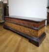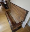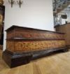 Elegante cassapanca in legno di noce massello, intagliata e dipinta. La cassapanca presenta una forma rettangolare, con piedi a mensola, un piano aggettante e una fascia modanata. Il piano è apribile, rivelando al suo interno un ampio spazio per riporre oggetti. La sua particolarità risiede nei decori pittorici, che ne esaltano l’eleganza, con motivi di intrecci vegetali su sfondo rosso e giallo, dal gusto e richiamo ancora rinascimentale. Si tratta di un mobile, probabilmente utilizzato come guardaroba o cassa nuziale, capace di arredare con raffinatezza e un tocco di antichità qualsiasi ambiente. Manifattura emiliana (Emilia-Romagna, Italia), del periodo Luigi XIV, intorno ai primi del XVII secolo.