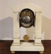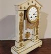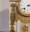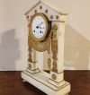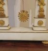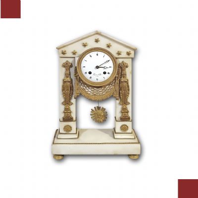 Elegante orologio a tempietto in marmo bianco con rifiniture in bronzo dorato. L’orologio si distingue per una base rettangolare, arricchita da due colonne ed una terminazione a tempio. La finitura è impreziosita da dettagli in bronzo dorato di ispirazione classica, come cariatidi ai lati, da un pendolo con un sole invitto, stelle e motivi geometrici, floreali e a festone, che conferiscono ulteriore raffinatezza all’oggetto. Il meccanismo comprende una suoneria settimanale che indica le ore e le mezz’ore, uno scappamento ad ancora ed una sospensione a filo. Sul quadrante sono segnate le ore in numeri romani e è presente la firma dell’orologiaio: “Thomas Keller”, insieme al luogo di produzione “au Puy”, riferito alla città francese di Le Puy-en-Velay. Si tratta di un orologio di grande gusto e antichità, capace di arredare con classe e raffinatezza qualsiasi ambiente. Manifattura francese del periodo neoclassico-Luigi XVI, intorno alla fine del XVIII secolo.