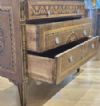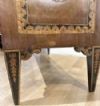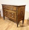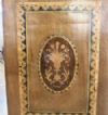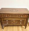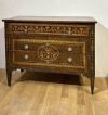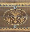Suntuoso cassettone lastronato in legno di noce, impreziosito da intarsi in legno di frutto e pastiglia, tecnica tipica della scuola ebanista lombarda. Il cassettone presenta gambe troncopiramidali, caratteristiche del periodo, e una forma lineare ed elegante. Dispone di tre cassetti, di cui uno più piccolo posizionato sotto il piano, e due cassetti più grandi e ergonomici ideali per riporre oggetti, aperti mediante tiranti in bronzo. La grande raffinatezza di questo cassettone risiede nella sua decorazione ad intarsio, molto ricca e dettagliata, che si estende sul fronte, sulle gambe, sui lati e sul piano, presentando motivi geometrici e fitomorfi. Si tratta di un mobile di grande gusto e qualità, in grado di arredare con classe e raffinatezza qualsiasi ambiente. Manifattura lombarda (Lombardia, Italia), probabilmente ascrivibile alla scuola dell’ebanista Giuseppe Maggiolini, del periodo neoclassico, intorno alla fine del XVIII secolo.