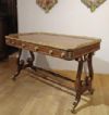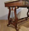 Bellissimo ed elegante scrittoio da centro, con lastronatura di alta qualità in legni di noce e palissandro, ed impreziosito da decorazioni in bronzo fuso a cera persa. Lo scrittoio si distingue per le sue gambe a lira, unite da parti tornite e decorate con dettagli floreali in bronzo dorato, con gambe che terminano in zampe ferine anch’esse in bronzo dorato, dotate di rotelle utili per facilitare lo spostamento. Il piano presenta una fascia ad intarsio ed una balaustra anch’essa in bronzo dorato, finemente cesellata, che conferiscono ulteriore eleganza. Nella fascia del sottopiano si trovano tre cassetti apribili con maniglie in bronzo dorato: due di medie dimensioni e uno particolare più piccolo, posizionato vicino all’angolo di destra, funzionale per penne e calamai. Si tratta di uno scrittoio di grande gusto e raffinatezza, capace di arredare con classe ed eleganza qualsiasi ambiente. Manifattura italiana, che richiama lo stile neoclassico degli ebanisti francesi, nel periodo Napoleone III, intorno alla metà del XIX secolo.