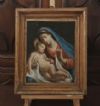 Bel dipinto ad olio su tavoletta lignea, inserito in una cornice d’epoca in legno intagliato e dorato a foglia d’oro, alla quale sono stati aggiunti supporti lignei sempre dell’epoca per adattarlo alla cornice. Nel dipinto è raffigurata la Madonna che svela il bambino Gesù. La donna indossa abiti canonici, con una veste rossa e un velo blu, sormontati da una sottile aureola di stelle. Con le mani tiene la fasciatura del bambino Gesù, che è nudo con una raggiante aureola. Di questo quadro si apprezza la resa stilistica dei dettagli e la dolcezza espressa, evidenziata dalle teste della madre e del figlio che si toccano e dai loro sguardi intensi. I colori sono originali e si segnalano infine pochissimi restauri. Si tratta di un dipinto di grande gusto e stile, in grado di conferire eleganza e un tocco di antichità a qualsiasi ambiente. Manifattura ascrivibile alla Scuola Veneta, intorno alla fine del XVIII secolo.