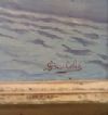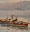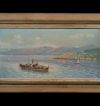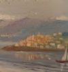 Grazioso dipinto ad olio su tavoletta lignea, inserito in una cornice di legno intagliato e dipinto. Nel dipinto è raffigurata una veduta paesaggistica con mare e montagne, dalla quale si intravede una marina con una città nelle vicinanze, probabilmente la marina di Pizzo Calabro, che richiama le origini calabresi del pittore. In mare si distinguono diverse barche a vela, tra cui due in primo piano con personaggi intenti a pescare. Si tratta di un quadro di grande gusto, apprezzabile per la sua resa stilistica e la scelta dei colori, in grado di donare un tocco di eleganza e classe a qualsiasi ambiente. In basso a destra è presente la firma del pittore italiano, Saverio Scutellà (1910-1993), con la data apposta sul retro da inquadrare intorno alla prima metà del XX secolo (1947 ca.).