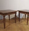 Elegante coppia di tavolini bassi lastronati e intarsiati in legno di noce, ulivo e altre essenze. I tavolini sono caratterizzati da gambe troncopiramidali, tipiche dello stile neoclassico, e da piani impreziositi da intarsi geometrici che ne aumentano l’eleganza. Si tratta di una coppia di tavolini di grande gusto e raffinatezza, capaci di arredare qualsiasi ambiente con un tocco di classe e di antichità. Manifattura toscana del periodo Luigi XVI, intorno alla fine del XVIII secolo.