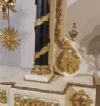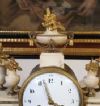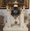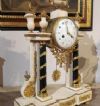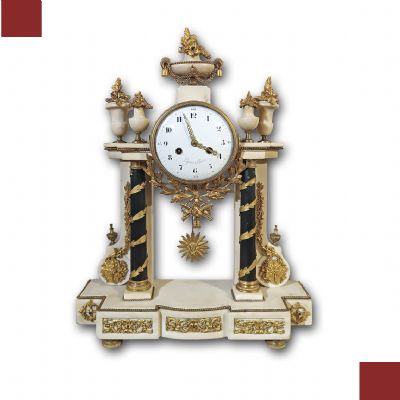 Refinado reloj de templo de grandes dimensiones. El reloj presenta una estructura en mármol blanco estatuario, decorada con columnas en mármol negro de Bélgica y particiones en bronce fundido a la cera perdida finamente dorado. Las decoraciones evocan el estilo clásico, con pequeños jarrones, motivos florales, geométricos, fitomorfos y figurativos. La esfera es abatible y presenta números arábigos, con manecillas en bronce dorado y la firma "Lépine Paris", atribuible al relojero. El mecanismo, original y funcional, está dotado de suspensión de hilo de seda y una carga semanal, que suena las horas y las medias horas. Se trata de un reloj de gran gusto y refinamiento, capaz de decorar con elegancia cualquier ambiente. Manufactura francesa del período Directorio, en torno a finales del siglo XVIII.
