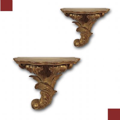 Elegante par de ménsulas de madera tallada y finamente doradas con pan de oro. Las ménsulas se caracterizan por una forma de cuerno de la abundancia, adornada con hojas entrelazadas y volutas, que confieren gran sofisticación a todo el conjunto. La superficie de apoyo presenta una línea ondulada en los bordes, añadiendo un toque de gracia. Se trata de un par de gran gusto y elegancia, capaz de dar un toque de clase y antigüedad a cualquier ambiente. Manufactura italiana de mediados del siglo XIX.