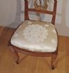 Raffinate dieci sedie in legno di ciliegio massello, finemente intagliate. Le sedie presentano gambe leggermente ricurve sul fronte, con terminazioni ferine, e una cartella a forma di lira realizzata in legno di cirmolo, intagliata e dorata a foglia d’oro zecchino, che ne esalta ulteriormente la raffinatezza. Sono dotate di una seduta confortevole, con cuscino rivestito in tessuto dorato-argentato con decori floreali. Si tratta di un set di sedie di grande gusto ed eleganza, in grado di aggiungere un tocco di classe all’arredo di qualsiasi ambiente. Manifattura lucchese (Toscana, Italia), del periodo Impero, intorno ai primi del XIX secolo.