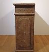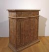 Raffinata piccola credenza in legno massello di abete, intagliata e dipinta a finto legno, che richiama le tecniche ebaniste bolognesi. Il mobile presenta un design lineare, con piedi a balaustra, e si caratterizza per due sportelli e un cassetto ergonomici, ideali per riporre oggetti. La sua particolare eleganza e raffinatezza risiedono nella decorazione pittorica presente sul fronte e sui lati, decorata con finti bulloni e bugnature, che rendono questo mobile davvero squisito. Si tratta di una credenza di grande gusto e raffinatezza, capace di arredare con un tocco di classe e antichità qualsiasi ambiente. Manifattura Emiliana (Emilia-Romagna, Italia) degli inizi del XVIII secolo.