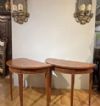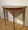 Raffinata e suntuosa coppia di consolle in legno di acero finemente intagliato. Le consolle presentano una forma a mezzaluna, con gambe dritte e troncopiramidali. La loro eleganza è esaltata dalle decorazioni dipinte ad olio direttamente sul legno, sia sul piano che sul sottopiano, raffiguranti motivi floreali a ghirlande e intrecci, oltre a due paesaggi di gusto classico dipinti all’interno di due riquadri sul piano. Grazie alla loro forma, è possibile unirle per creare un tavolino rotondo, poiché l’altezza è ideale per questa funzione. Si tratta di due consolle di grande stile e raffinatezza, capaci di arredare qualsiasi ambiente con un tocco di classe e di antichità. Manifattura tipica inglese della prima metà del XIX secolo.
