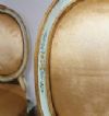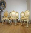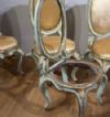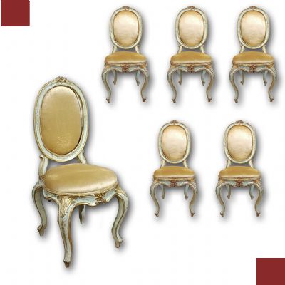Elegante set di sei sedie in legno massello intagliato, laccato, dipinto e dorato. Il loro fascino è esaltato dalla finitura in laccatura di colore celeste pastello, che si armonizza con l’imbottitura dello schienale e della seduta, entrambe dorate. Elemento di ulteriore raffinatezza sono i decori in legno intagliato a motivi vegetali presenti sul fronte e sui lati, così come le pitture raffiguranti piccole ghirlande di foglie, che conferiscono un tocco di eleganza in più. La struttura si caratterizza per una cartella ovale e gambe mosse, tipiche dello stile Luigi XV. Queste sedie sono in grado di arredare con gusto e classe qualsiasi ambiente. Manifattura veneziana della metà del XVIII secolo.