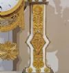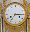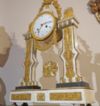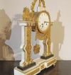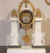 Raffinato orologio a tempietto, realizzato in marmo bianco statuario di Carrara e decorato con bronzo dorato al mercurio. L’orologio presenta eleganti decorazioni in bronzo, caratterizzate da motivi geometrici e fitomorfi, arricchite da ghirlande di fiori e palmette ai lati delle colonne. Il pendolo è ornato da una classica raffigurazione con figura raggiata, mentre il quadrante, apribile, indica le ore in numeri romani e reca l’iscrizione “Paris”, che ne testimonia la provenienza dall’orologiaio. Il meccanismo, con sospensione a filo di seta, è dotato di suoneria che segnala le ore e le mezze ore. Si tratta di un orologio di grande gusto e raffinatezza, capace di arredare con classe qualsiasi ambiente. Manifattura francese del periodo Direttorio, intorno alla fine del XVIII secolo.