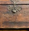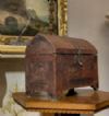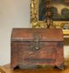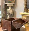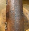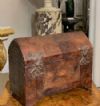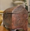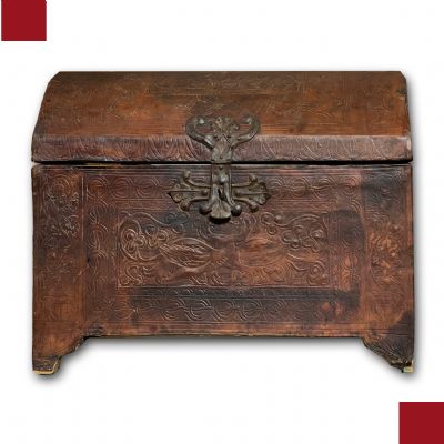 Particolare cassina portacandele in legno rivestito in pelle marchiata a fuoco, con cerniere in bronzo. La cassina presenta decorazioni floreali e geometriche che creano dei riquadri entro i quali sono raffigurate immagini zoomorfe come due pavoni che si intrecciano (sul fronte e sul retro), un serpente e un'aquila (sui lati dell'oggetto). Sono presenti lievi mancanze e usure ai piedi della cassina. L'oggetto è da ascrivere a manifattura veneta, in stile neo-rinascimentale, del XIX secolo.