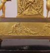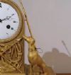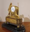 Raffinato orologio in bronzo dorato, montato su una base in legno ebanizzato e dotato di campana in vetro a protezione. L’orologio è decorato da una figura statuaria posta sulla sinistra, identificabile come Adone, l’amante della dea Venere, con gli attributi tipici da cacciatore; anche sulla destra sono raffigurati un cane da caccia e una lancia. Inoltre, alla base dell’orologio è rappresentata una scena di chiaro richiamo classico, in cui si riconoscono Adone disteso e probabilmente la dea della caccia, Diana, che lo sveglia con in mano un arco. Il quadrante dell’orologio è decorato con motivi di trionfo e presenta numeri romani. Il meccanismo, originale dell’epoca, è a sospensione a filo di seta, e la suoneria riproduce il suono delle ore e delle mezze ore; la macchina è integra e attualmente in fase di revisione. Si tratta di un orologio di grande classe ed eleganza, in grado di aggiungere un tocco di raffinatezza e antichità all’arredamento di qualsiasi ambiente. Manifattura francese del periodo neoclassico, intorno alla fine del XVIII secolo.