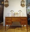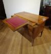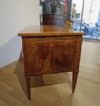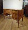 Raffinato scrittoio in legno massello e lastronatura di noce. Lo scrittoio è decorato con intarsi sui lati, sul fronte e sul piano, con motivi geometrici realizzati in legno di noce e ciliegio, che donano ulteriore eleganza. È inoltre caratterizzato da cinque cassetti sul fronte, di cui quello centrale più ampio, progettati ergonomicamente per riporre oggetti. Il mobile presenta sotto il piano un ripiano scorrevole rivestito in pelle rossa dell’epoca, e la sua particolarità risiede nello scorrimento anche del piano principale, che consente di lavorare sullo scrittoio senza dover porre le gambe al di sotto, creando così più spazio per il lavoro. Lo scrittoio è inoltre a giorno, con retro a finti cassetti e serrature, rendendolo adatto anche ad essere collocato al centro della stanza. Si tratta di un mobile di grande gusto e raffinatezza, in grado di arredare con classe ed eleganza qualsiasi ambiente. Manifattura toscana del periodo Luigi XVI, intorno alla seconda metà del XVIII secolo.