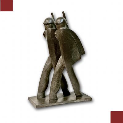 Unica e preziosa scultura in bronzo fuso a cera persa. Intitolata “Soldati in marcia”, rappresenta due soldati che avanzano marciando, con gambe divaricate, elmo distintivo del reggimento di fanteria della Seconda Guerra Mondiale, fucile appoggiato sulla schiena e mantello al vento, collocati su una base rettangolare. La scultura è tipicamente futurista, espressione di un movimento d’avanguardia, in cui si evidenziano influenze del cubismo e del surrealismo, con una ricerca di tridimensionalità che riflette il dinamismo e l’energia del mondo moderno, noto come “dinamismo plastico”. Si presenta in ottime condizioni, con sulla gamba posteriore il monogramma dell’artista “D. B”, che permette di attribuirla all’artista veneto Renato Di Bosso (1905-1982), grande esponente del futurismo, largamente influenzato dalle opere di Boccioni. Della scultura è inoltre conservato un bozzetto, dipinto dall’artista e databile al 1936. Si tratta di un’opera di grande valore e unicità, capace di impreziosire qualsiasi ambiente con un tocco di eleganza e storia. Manifattura italiana degli anni ’30 del XX secolo.