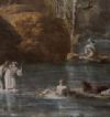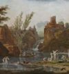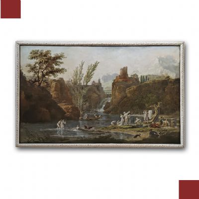 Elegante dipinto ad olio su tela, in cornice di legno intagliato e dipinto. Nel dipinto è raffigurata una scena al fiume all’interno di una radura, con sullo sfondo la rocca di Tivoli, un ponte ed altri edifici. In primo piano, si notano figure maschili e femminili intenti a fare il bagno o a spogliarsi, accompagnate anche da cani e da una piccola barca. L’opera mette in risalto la tecnica pittorica e stilistica, risultando un dipinto di grande classe ed eleganza, capace di donare un tocco di raffinatezza e di antichità a qualsiasi ambiente. Manifattura del centro-Italiana della fine del XVIII secolo.