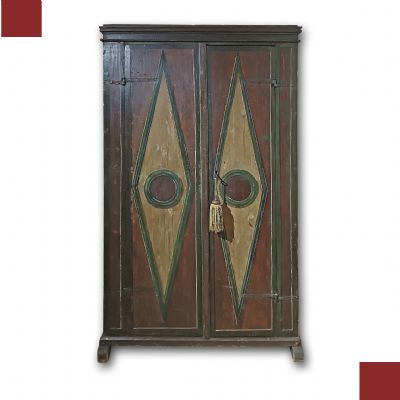Raffinato stipo in legno massello di castagno, intagliato e dipinto a tempera magra, privo di sottofondo gessoso. Lo stipo si distingue per piedi lineari, una terminazione superiore a modanature e due ante. Di queste, una è apribile mediante chiave e serratura, mentre l’altra è dotata di serratura interna ad incastro; entrambe si aprono su quattro ripiani ergonomici ideali per riporre oggetti. La decorazione pittorica del mobile è di grande raffinatezza, presente sia sul fronte che sui lati, e si caratterizza per motivi geometrici, lineari e a rombi, nei colori del rosso, verde e giallo. Si tratta di un mobile di grande gusto ed eleganza, capace di donare un tocco di classe e di antichità a qualsiasi ambiente. Manifattura Toscana-umbra (centro-Italia), intorno agli inizi del XVIII secolo.